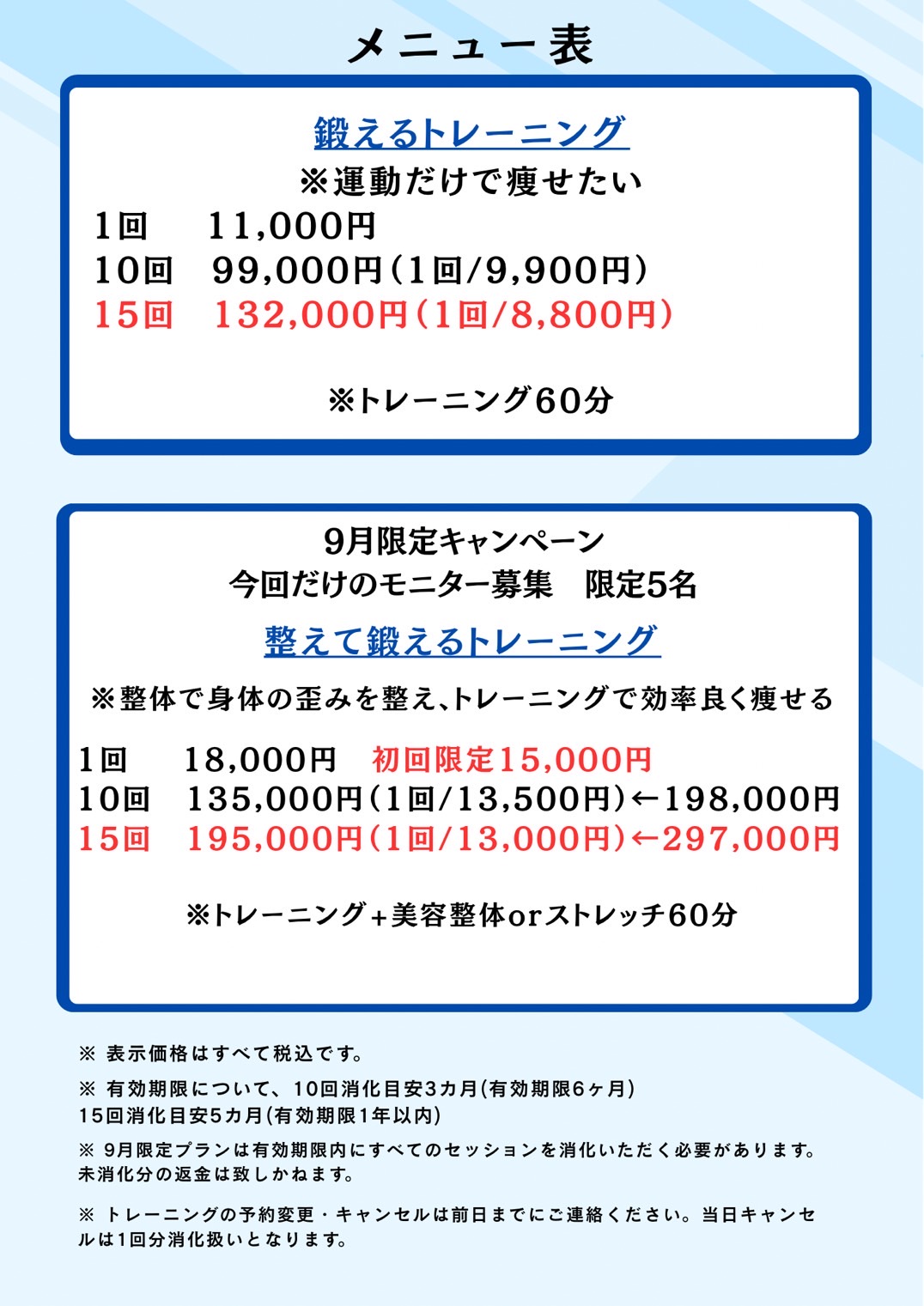 痩せると決めて運動が続かない。 痩せていた自分に戻りたい。 自信がもてる体型になりたい。 年々、体力が落ちてきたと感じる。 産後太りで体型が気になる。 着れなくなった服を着たい。 ゴルフの飛距離が出なくなってきた。 皆さんのお悩みを解消しましょう。 目標達成までサポートしています。